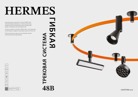 Инновационную трековую систему HERMES 48В отличает функциональность, отличные световые характеристики, привлекательный современный дизайн и широкий спектр применения. Основу системы составляет гибкий трек с конструкцией, позволяющей создавать переходы в разных плоскостях. Треки выполнены в двух цветах: базовый черный и яркий акцентный оранжевый.